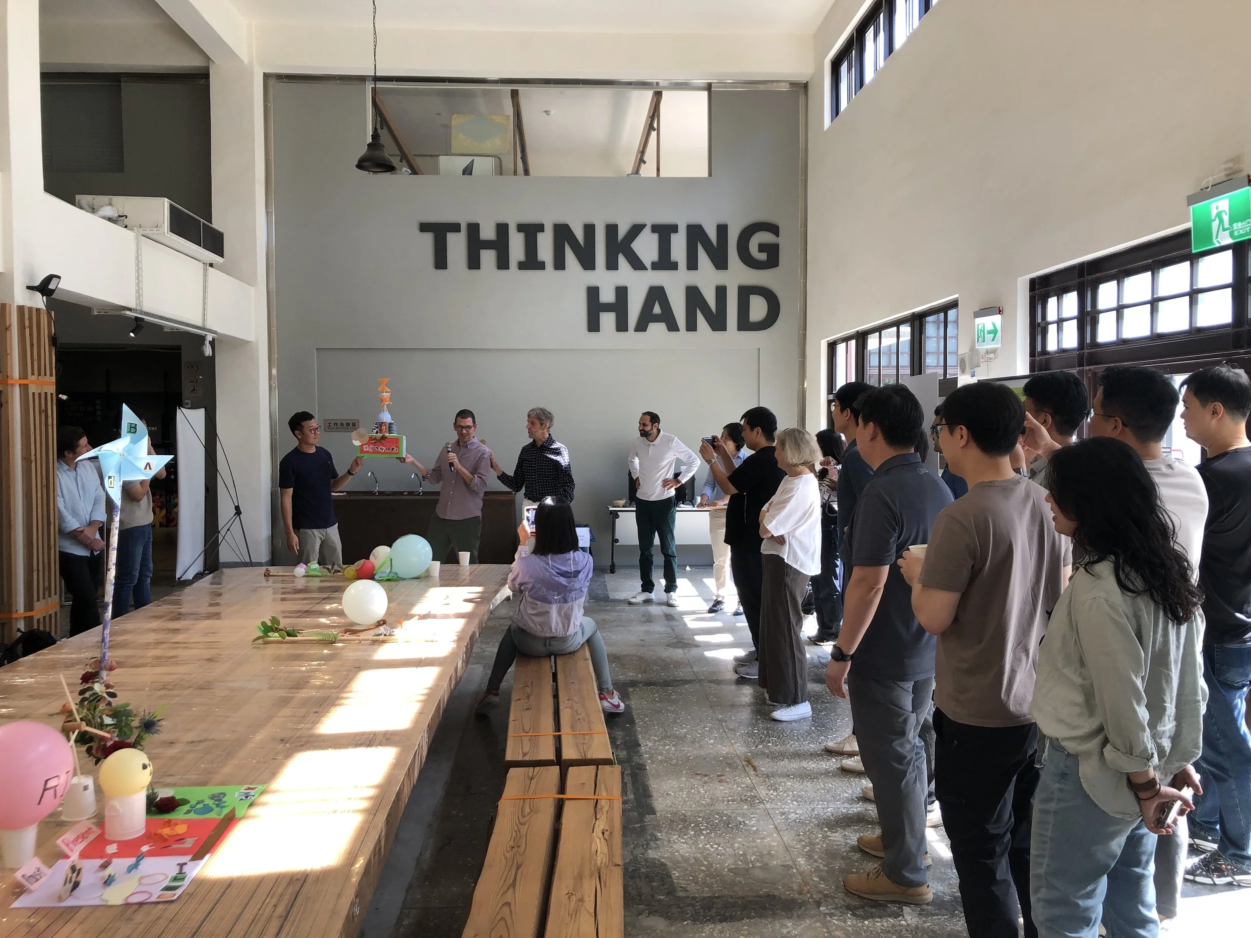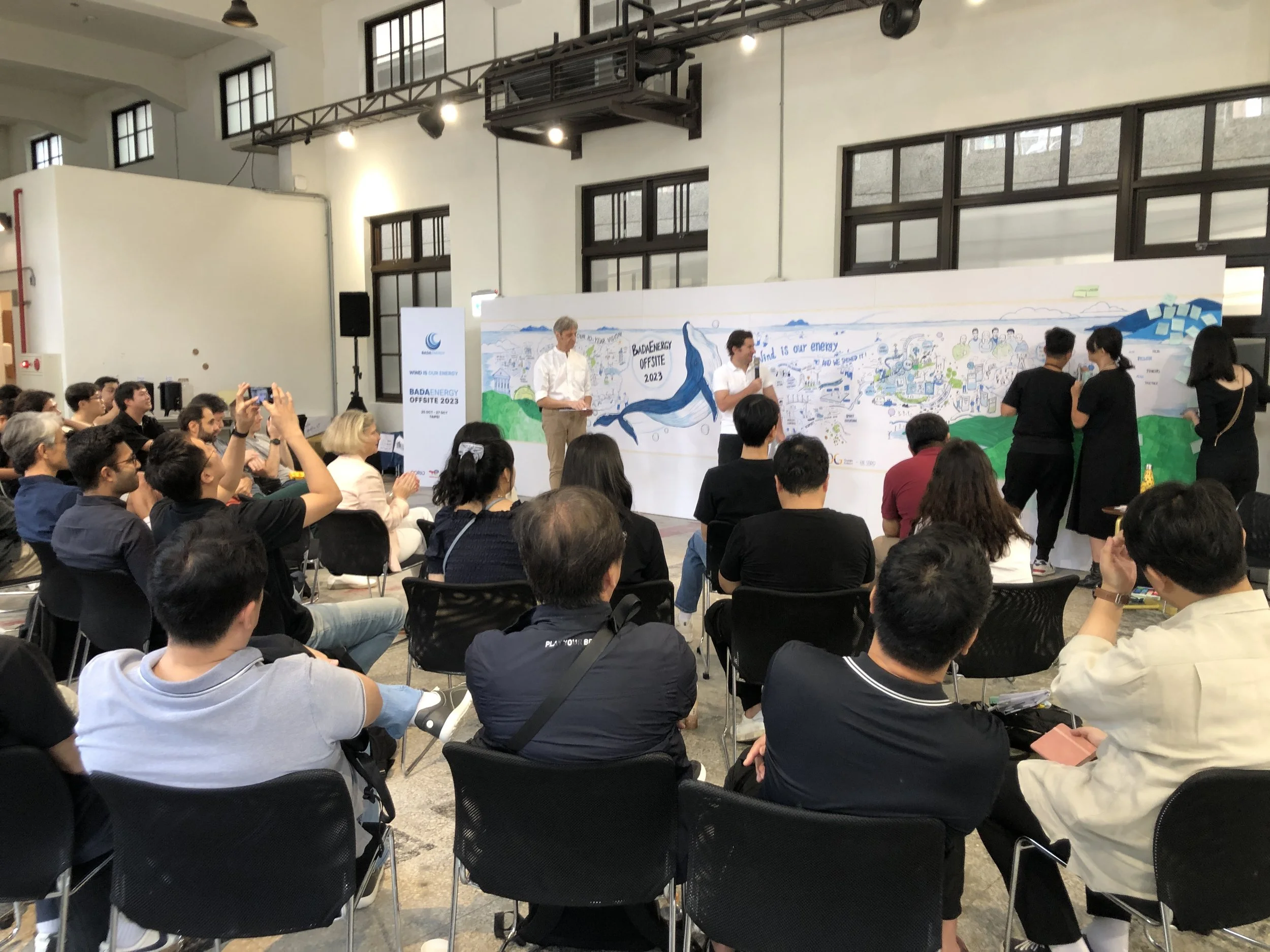 This Korean company off-site starts with a well-structured and high-paced cross-team information exchange. Next, participants use visual tools such as handmade artwork and paintings to illustrate their vision of the project’s goals, strengthening long-term execution and confidence. The 3-day content is visually documented by a graphic recorder, producing a large mural that symbolizes the team’s commitment. The group takes it back to the project office to inspire all members (as well as the project manager who unfortunately fell ill).